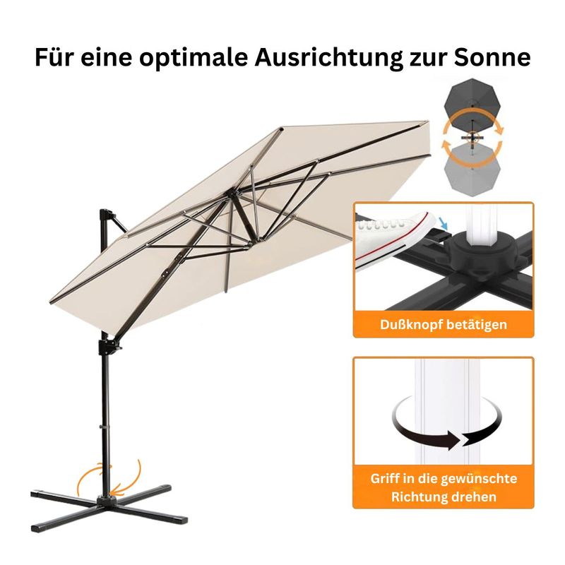 Hinweis: Gewichte zur Beschwerung des Schirmfußes nicht im Lieferumfang enthalten. Die Farbe des Stoffs kann leicht von den Produktbildern abweichen.