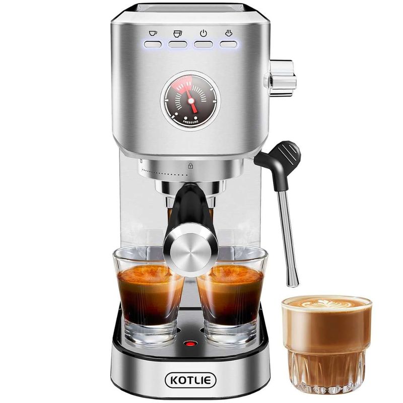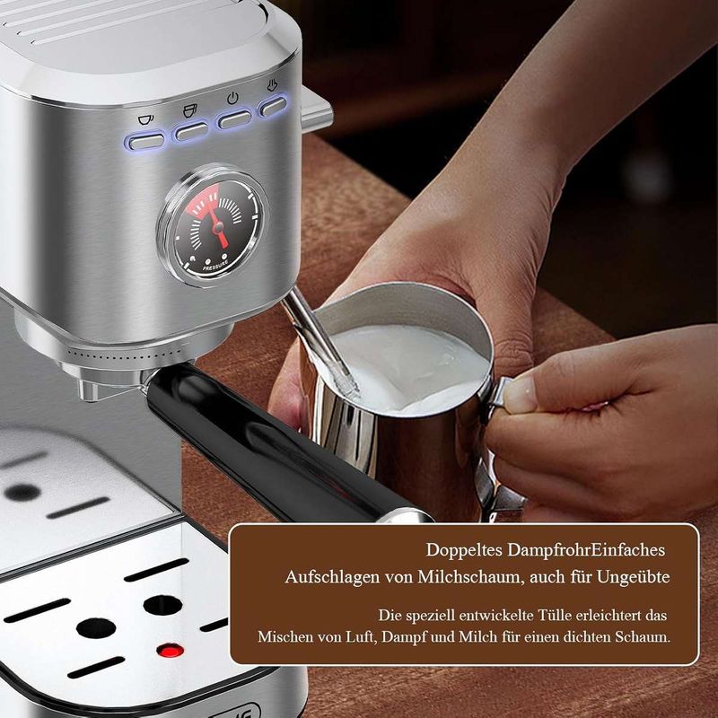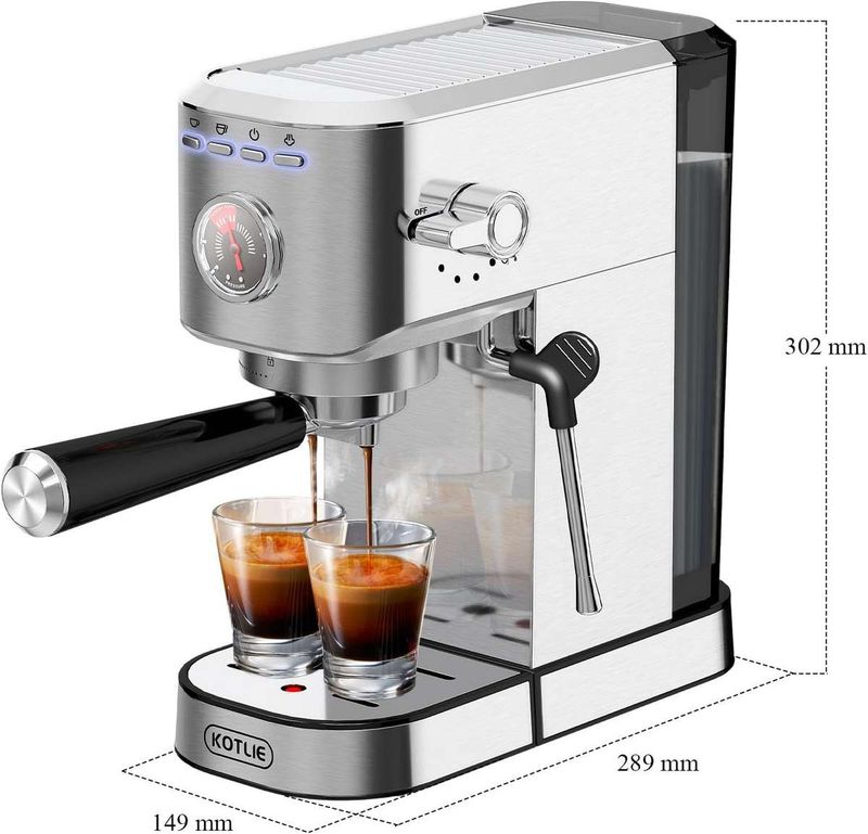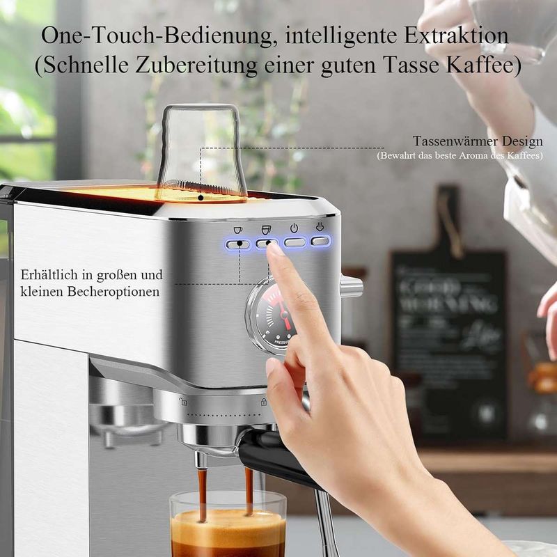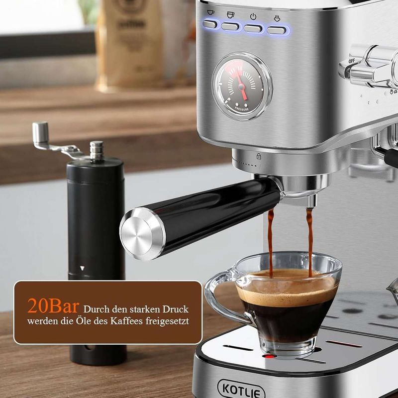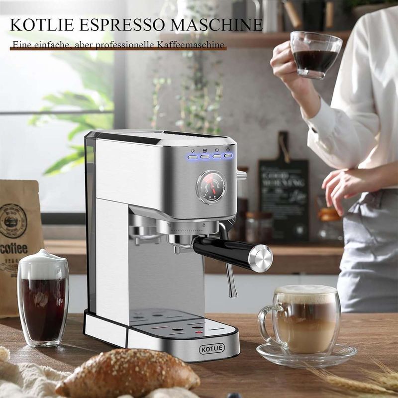 Die Espressomaschine von KOTLIE kombiniert modernes Design mit professioneller Leistung für perfekten Kaffeegenuss zu Hause. Mit einer Leistung von 1350 W und bis zu 20 bar Pumpendruck zaubert sie aromatischen Espresso mit dichter, goldbrauner Crema. Dank der schnellen Aufheizzeit und einer Extraktionszeit von nur 25 Sekunden ist sie auch in Eile einsatzbereit – ideal für den schnellen, aber vollen Genuss am Morgen. Der integrierte Milchaufschäumer mit Dampfdüse verwandelt Milch in feinporigen Schaum für Cappuccino, Latte Macchiato oder Heißgetränke. Die rippleförmige Tassenablage auf der Oberseite dient gleichzeitig als Tassenwärmer, damit Ihr Kaffee länger heiß bleibt. Mit abnehmbarer Tropfschale und 1 L Wassertank ist die Reinigung einfach und komfortabel, während der beschwerte Griff für ein besonders angenehmes Handling sorgt. Geeignet für Kaffeepulver und 44 mm E.S.E.-Pads, bietet die Maschine maximale Flexibilität. Ein eleganter Begleiter für stilvollen Kaffeegenuss – leistungsstark, praktisch und mit Liebe zum Detail gefertigt.