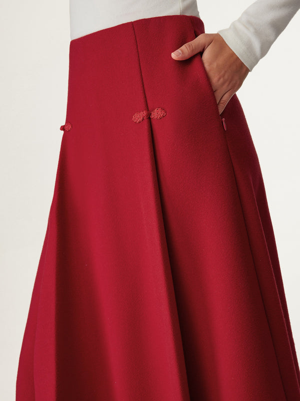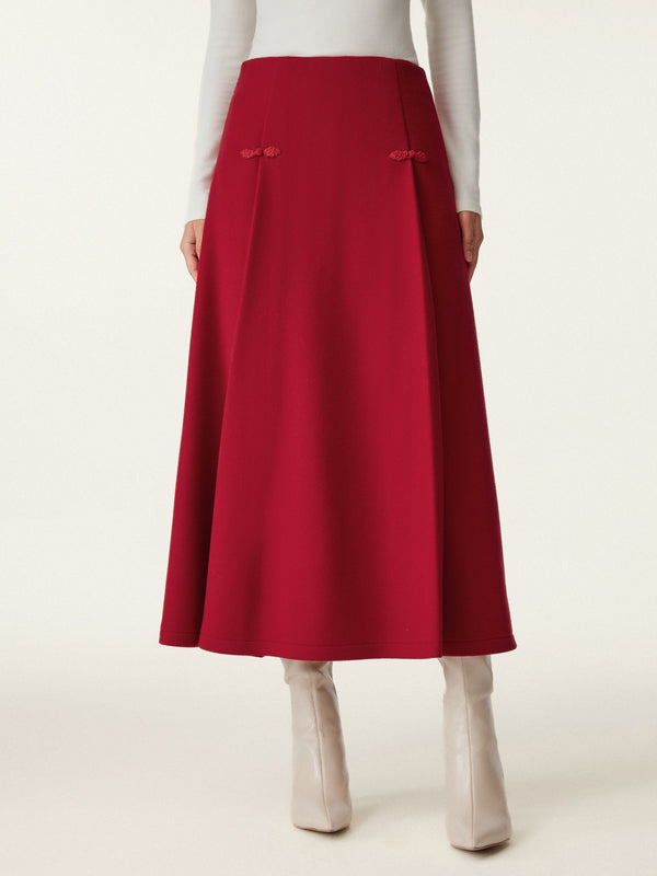 Der wollähnliche A-Linien-Midirock mit Froschknöpfen ist eine zeitlose Ergänzung für Ihre Garderobe. Er verfügt über eine hohe Taille und einen weichen Fall für eine schmeichelhafte Passform. Froschknopfdetails verleihen ihm eine einzigartige Note, während versteckte Reißverschlusstaschen praktischen Komfort bieten, ohne das klare Design zu beeinträchtigen. Kombinieren Sie ihn mit einem Blazer oder einem Strickoberteil für vielseitige Stylings – von lässigen Tagen bis hin zu eleganten Looks.