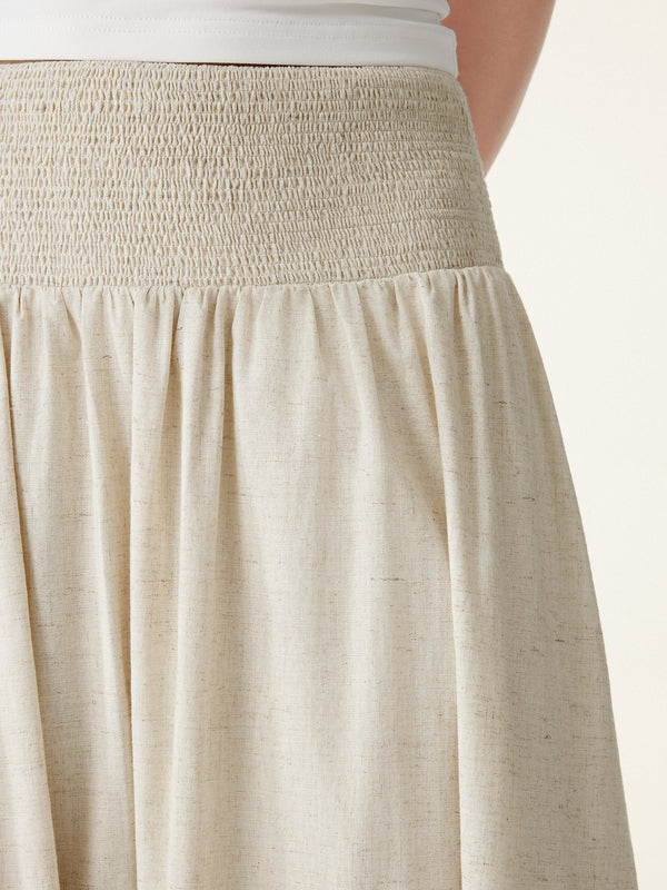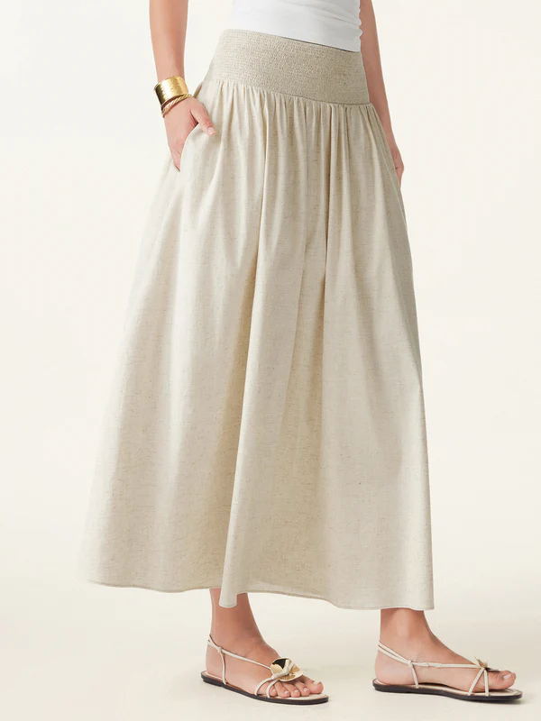 Weiches Volumen und Alltagstauglichkeit stehen im Mittelpunkt. Der gesmokte Bund sorgt für einen bequemen Sitz, während die fließende Länge bis unter die Wade eine anmutige Silhouette zaubert. Mit Taschen und Futter ist es ebenso praktisch wie hübsch – perfekt für alles, vom Brunch bis zum Urlaubsspaziergang.
